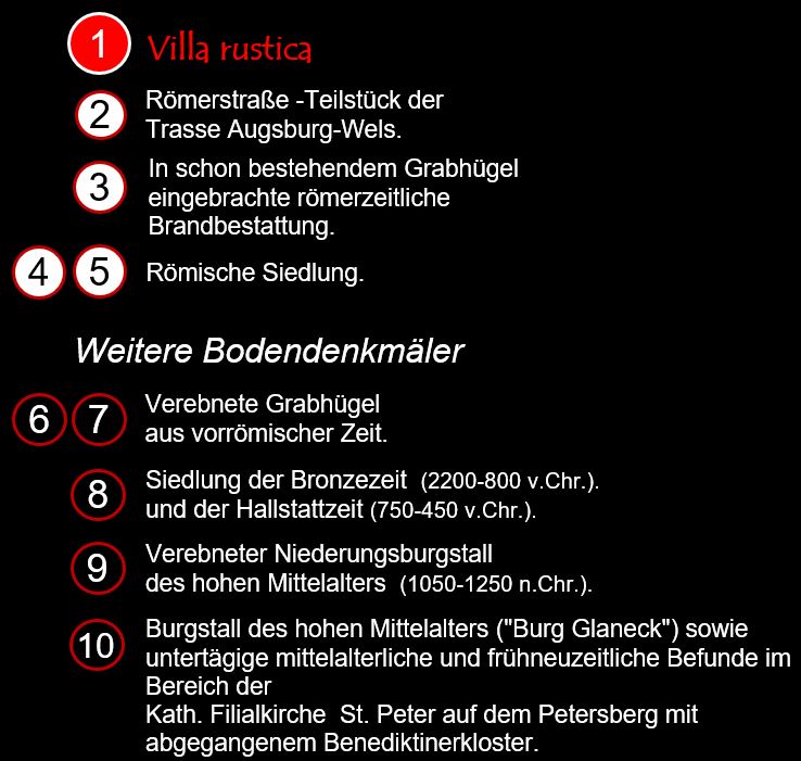 Bereits 1921 sind Reste dieses vermutlich bedeutendsten römischen Gutshofs im Landkreis Dachau, aus dem 3. – 4. Jhd. n. Chr., durch den Museumsverein Dachau ausgegraben worden. Damals wurden die Grundrisse von fünf Gebäuden (darunter ein Wohnhaus und ein Badehaus) aufgedeckt. Nahezu vollständig geborgene, rechteckige Hohlziegel (Tubuli – siehe Fundstücke) lassen darauf schließen, dass Boden und Wände zumindest in Teilbereichen der Villa rustica durch künstlich erwärmte Luft gleichmäßig beheizt wurden. Die Römer waren damit ihrer Zeit weit voraus. Es dauerte bis in die 70er Jahre des 20. Jahrhunderts bis die Annehmlichkeiten einer Wand- und Fußbodenheizung in unsere Wohnwelten zurückkehrten. Neben kunstvollen Glasgefäßen, wie dem bei Großberghofen entdeckten Kännchen, stellten die Römer bereits Flachglas für die Fenster ihrer Gebäude her. Diese Fertigkeit ging in der Völkerwanderungszeit wieder verloren.